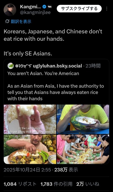 元々のポストで「アジア人はみんな素手でご飯食べる文化がある~」みたいな一括りな語られ方してたから東南アジア人はそれに対する意見やろこれは