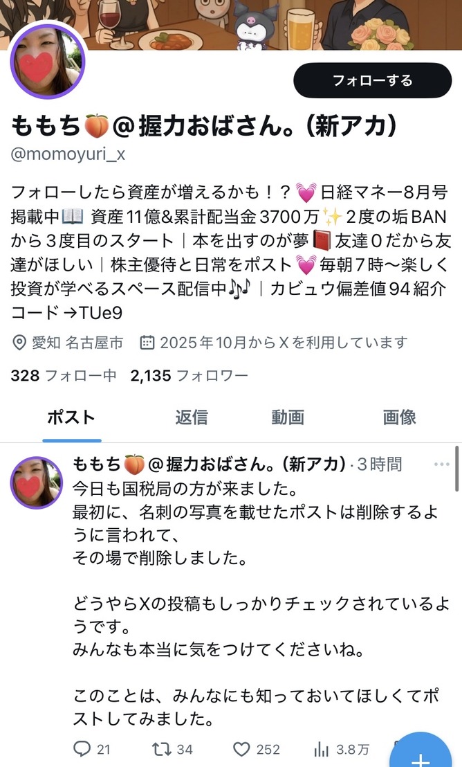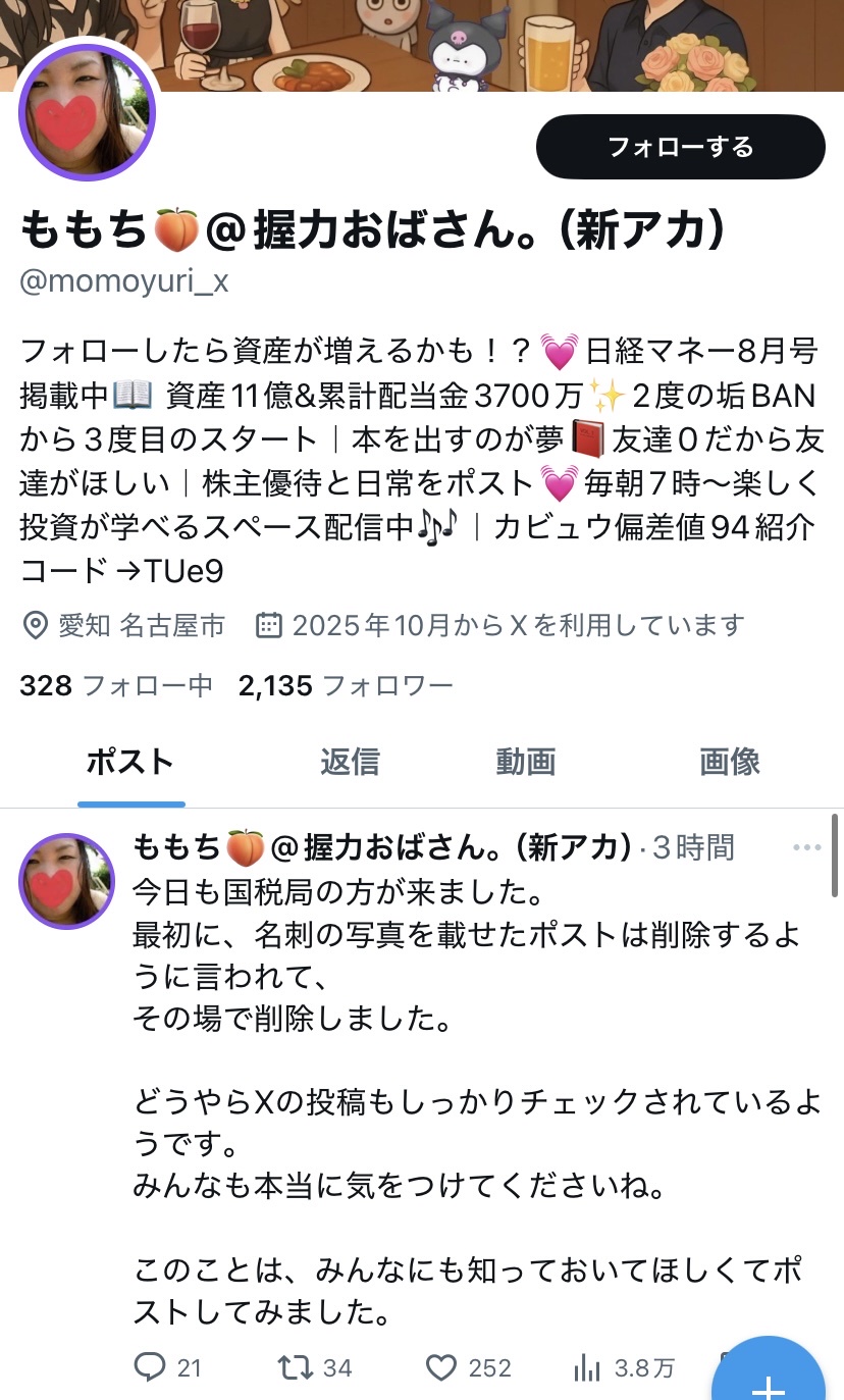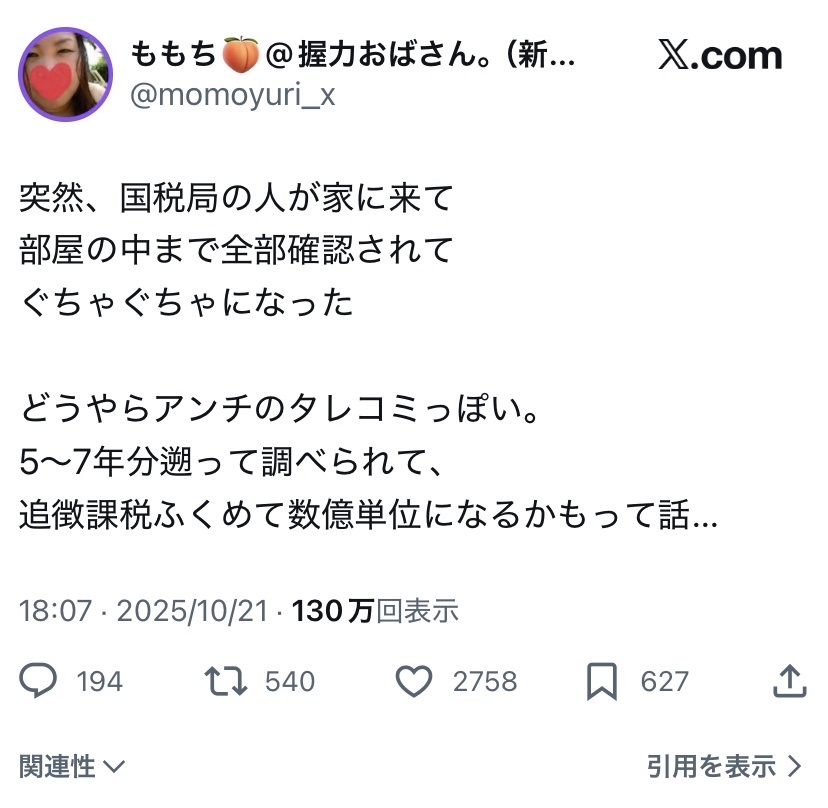 追徴課税ふくめて数億単位になるかもって話…— ももち🍑@握力おばさん。(新アカ) (@momoyuri_x) October 21, 2025