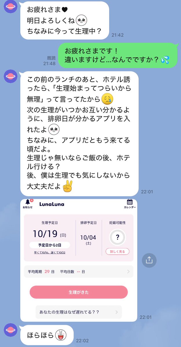 食事以上が嫌だったから生理って適当に言い訳したらそれを元にルナルナ入れられてる