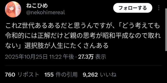 これZ世代あるあるだと思うんですが、「どう考えても令和的には正解だけど親の思考が昭和平成なので取れない」選択肢が人生にたくさんある