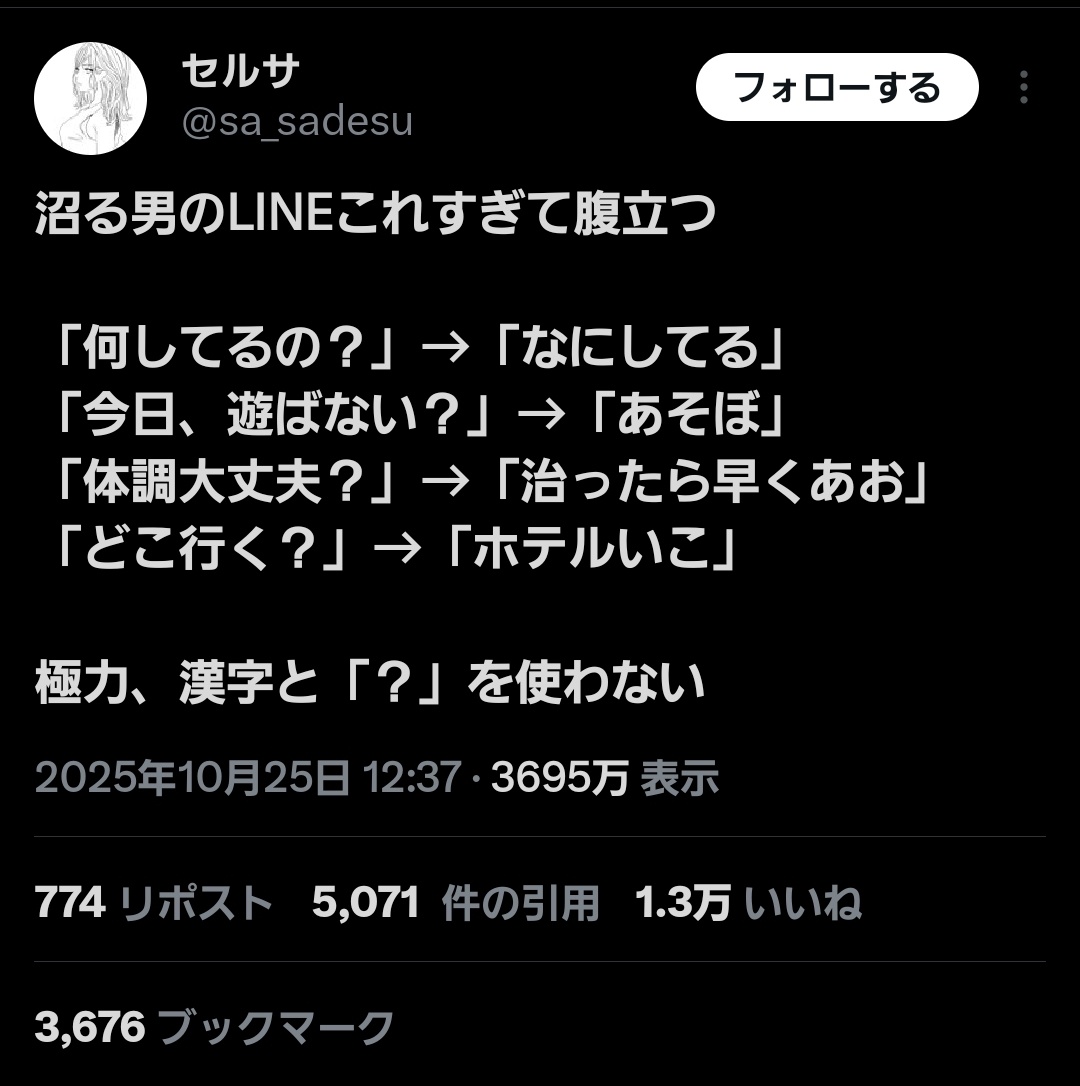 「どこ行く?」→「ホテルいこ」極力、漢字と「?」を使わない