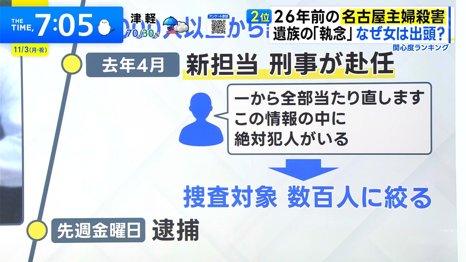 【名古屋主婦殺害事件】昨年赴任した新担当刑事「一から全部当たり直しましょう」 → 逮捕へ 2025/11/4 ゴールデンタイムズ 1 :ななしさん :25/11/03(月) 19:13:47 ID:??? オイオイ瞬殺だよ 4 :ななしさん :25/11/03(月) 19:14:42 ID:??? すげ… 2 :ななしさん :25/11/03(月) 19:14:33 ID:??? 有能な刑事っているんだなぁ 続きを読む Source: ゴールデンタイムズ