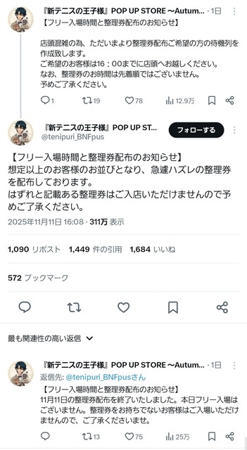 テニプリポップアップストアに転売ヤーが押しかけ、急遽整理券を配ることに