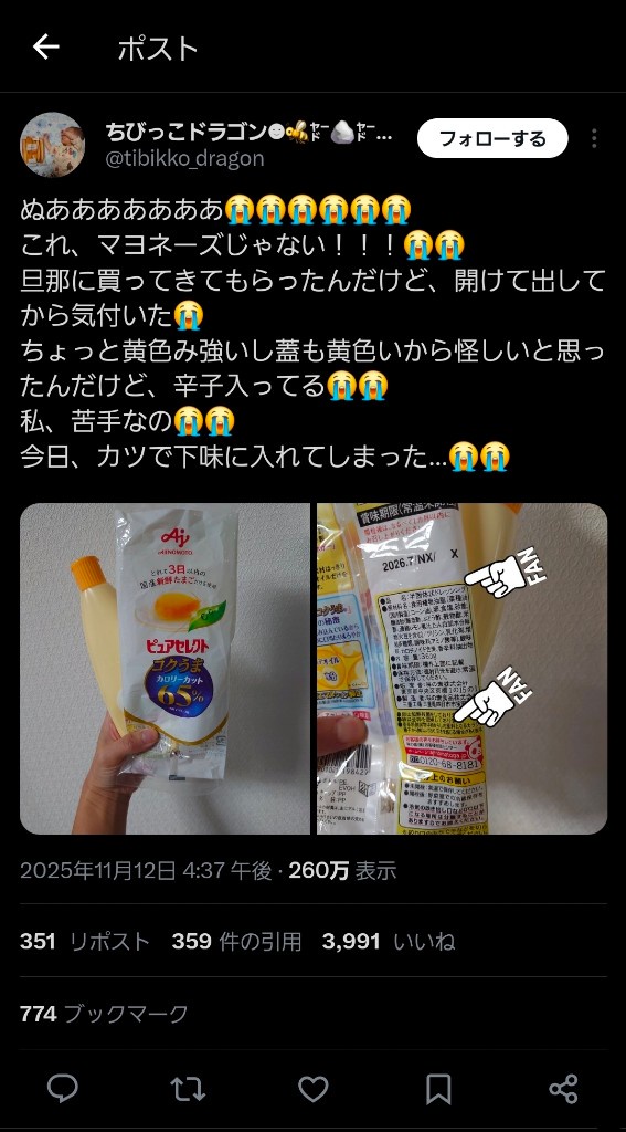 今日、カツで下味に入れてしまった…😭😭 pic.twitter.com/StSs5ROln2— ちびっこドラゴン☻🐝㍎🪨㍎✌㍎ (@tibikko_dragon) November 12, 2025