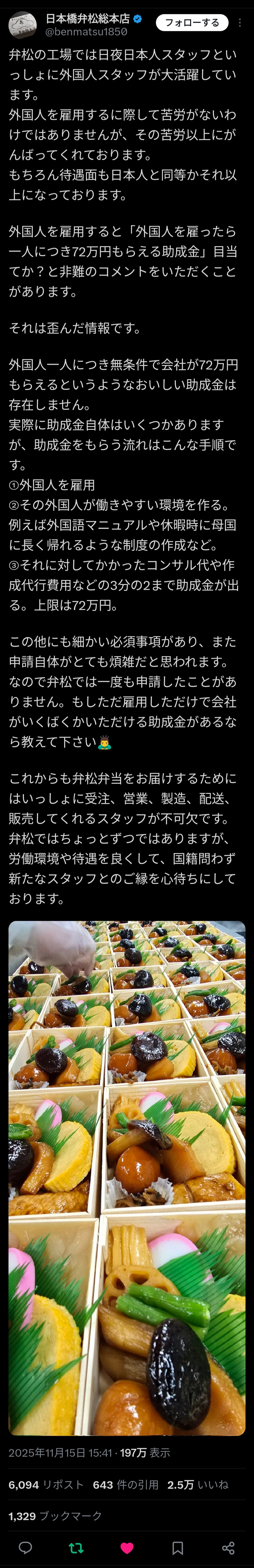 【悲報】弁当屋「外国人を雇うだけで72万の助成金があるというのはデマ」X民「買うのやめます」「賃上げしろ」
