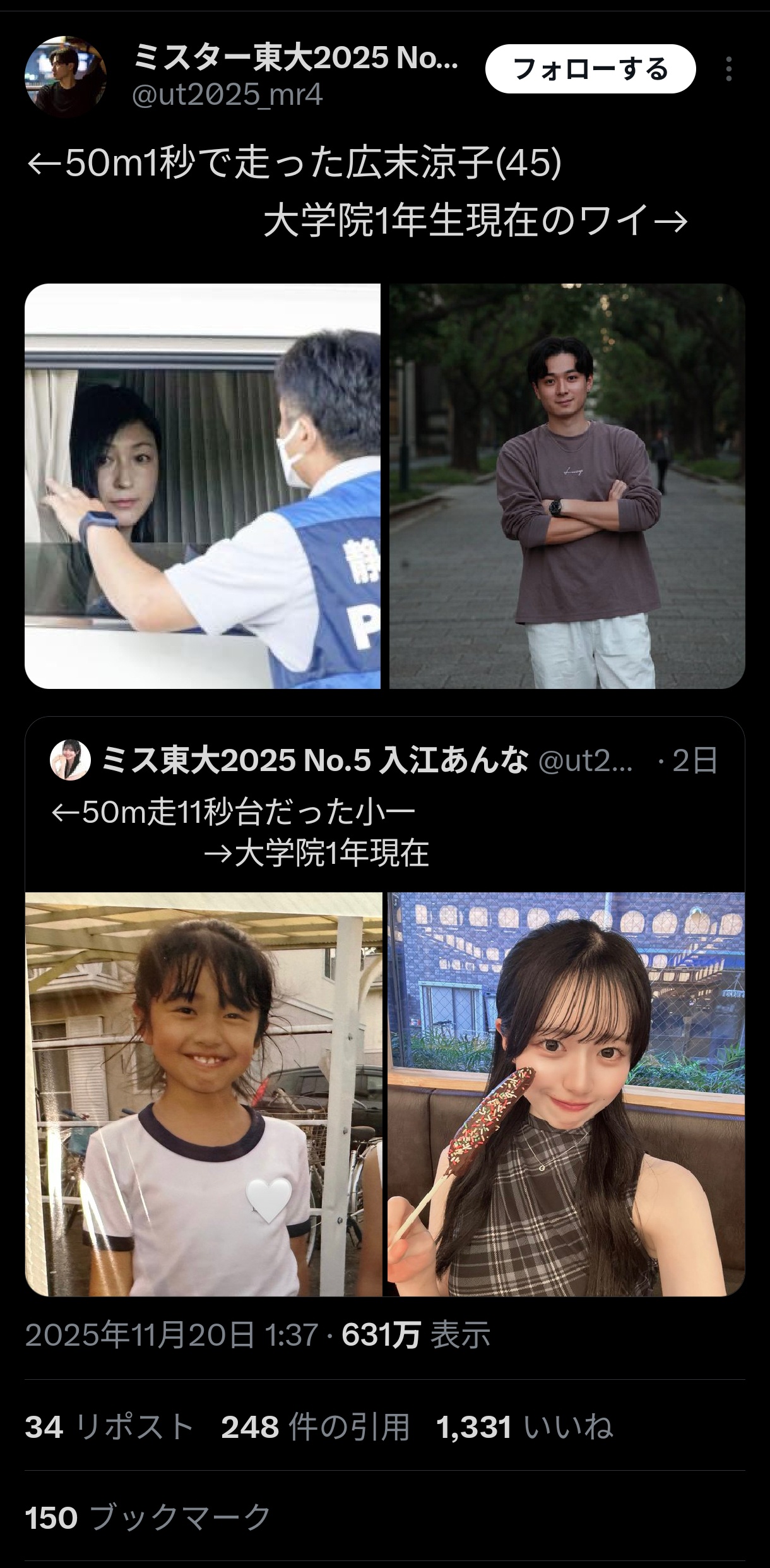大学院1年生現在のワイ→ https://t.co/wGXqIi7asu pic.twitter.com/obSlJXV6xI— ミスター東大2025 No.4 増田悠佑 (@ut2025_mr4) November 19, 2025