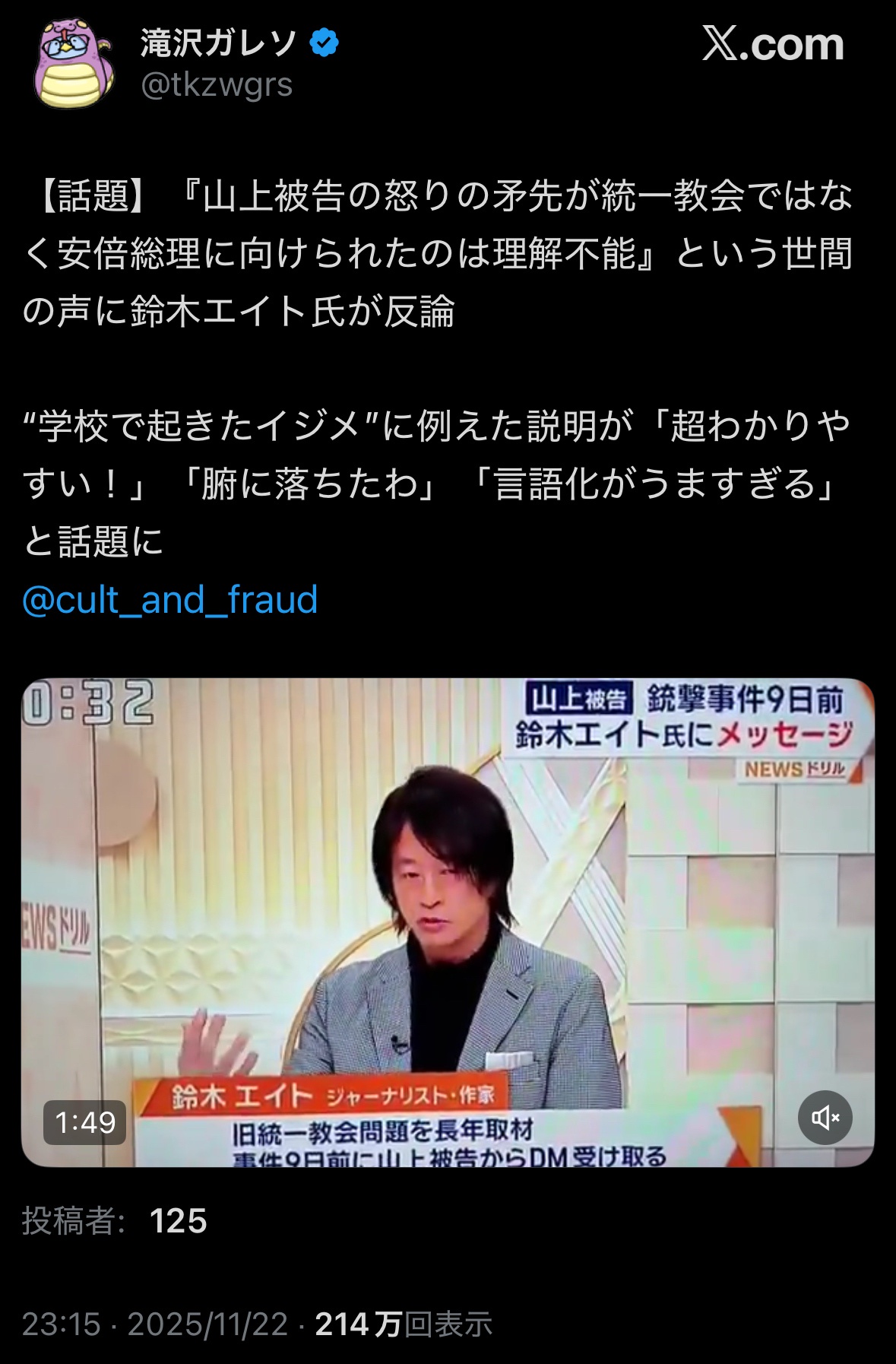 【話題】『山上被告の怒りの矛先が統一教会ではなく安倍総理に向けられたのは理解不能』という世間の声に鈴木エイト氏が反論