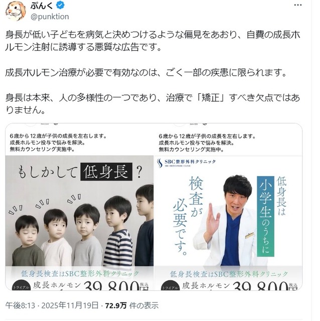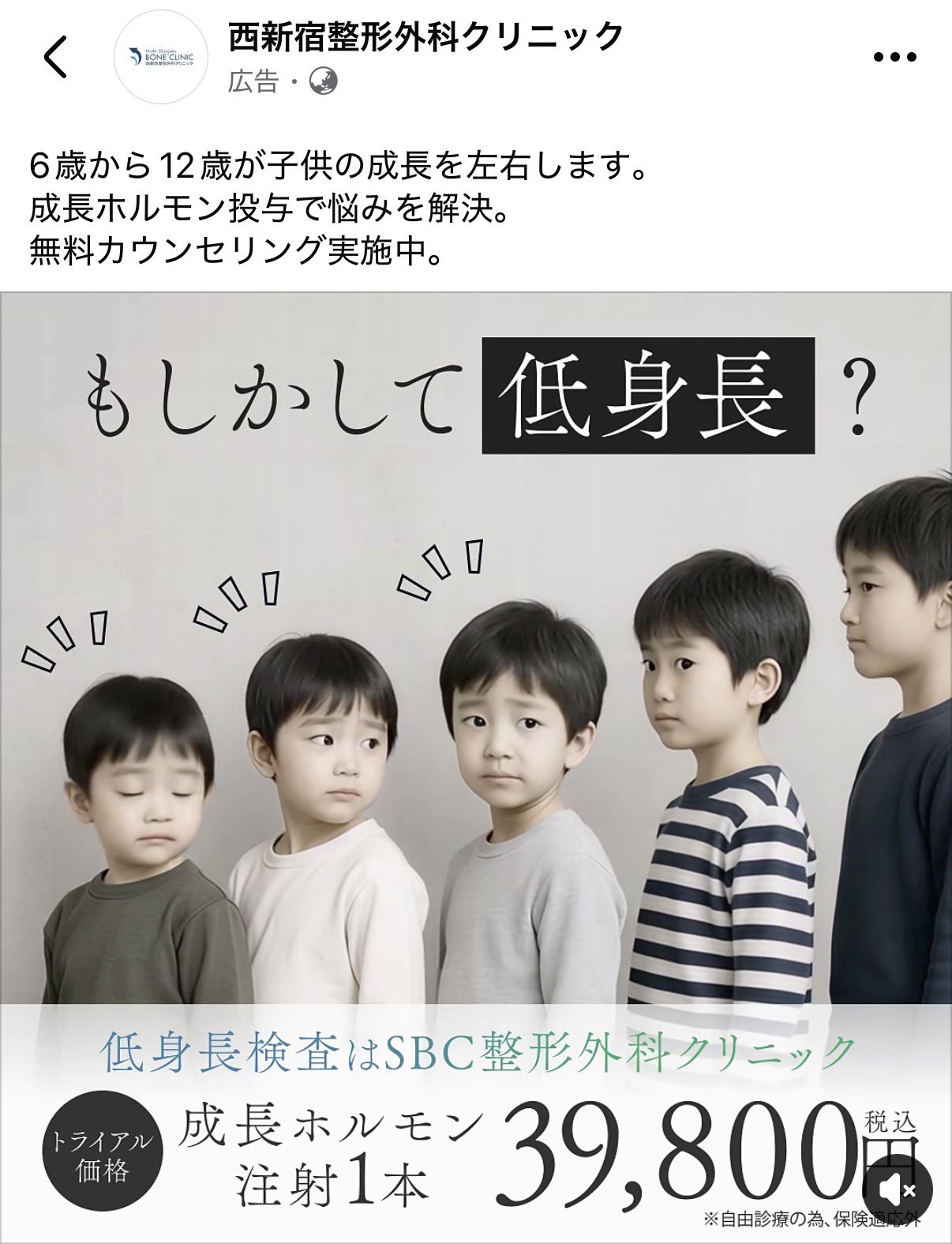 【悲報】美容整形業界、低身長な子供への成長ホルモン投与を推奨 2025/11/24 キニ速 1:名無し :2025/11/23(日) 20:28:47.304ID:UwuQFtGtX 身長が低い子どもを病気と決めつけるような偏見をあおり、 自費の成長ホルモン注射に誘導する悪質な広告です。 2:名無し :2025/11/23(日) 20:29:10.021ID:AiRkNnQY5 メッシになれるかもしれん 3:名無し :2025/11/23(日) 20:29:14.315ID:78V87VxRx リオネル・メッシ 続きを読む Source: キニ速
