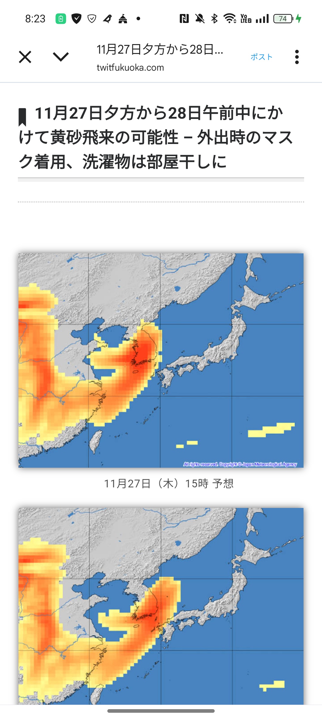 11月27日夕方から28日午前中にかけて黄砂飛来の可能性 – 外出時のマスク着用、洗濯物は部屋干しに – 福岡のニュース