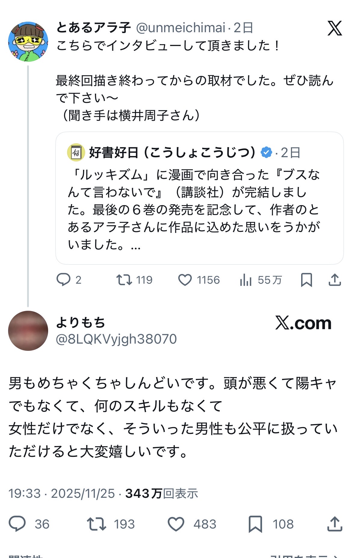 「ルッキズム」に漫画で向き合った『ブスなんて言わないで』(講談社)が完結しました。最後の6巻の発売を記念して、作者のとあるアラ子さんに作品に込めた思いをうかがいました。https://t.co/zP8SCIIoB0