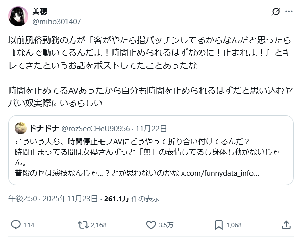 以前風俗勤務の方が「客がやたら指パッチンしてるからなんだと思ったら『なんで動いてるんだよ!時間止められるはずなのに!止まれよ!』とキレてきたというお話をポストしてたことあったな