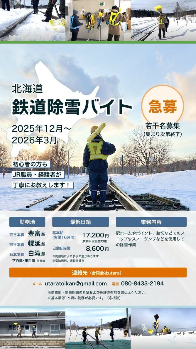 【ハロワ速報】北海道の鉄道で今年も雪かき(うまい飯が食えて寮完備)がアルバイト大募集中!お前ら急げ!