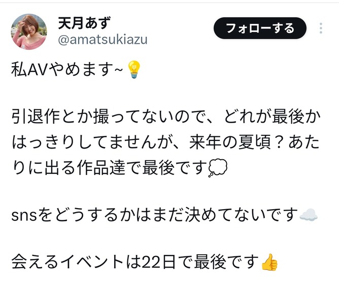 【悲報】人気AV女優の天月あず、突然の引退宣言