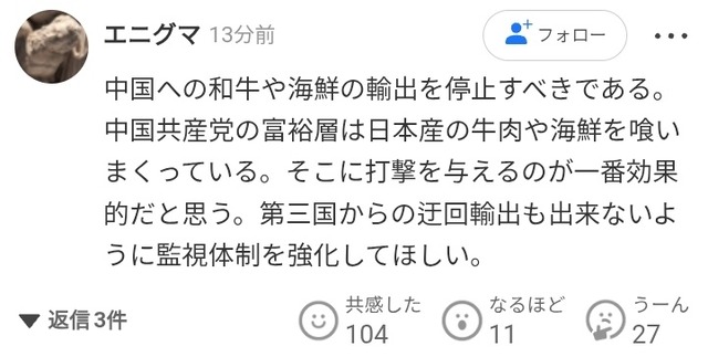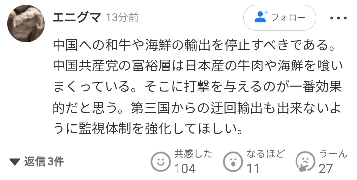 普通の日本人「報復として和牛や海鮮品の輸出を止めたれ。美食家の中国人は大打撃だ。」