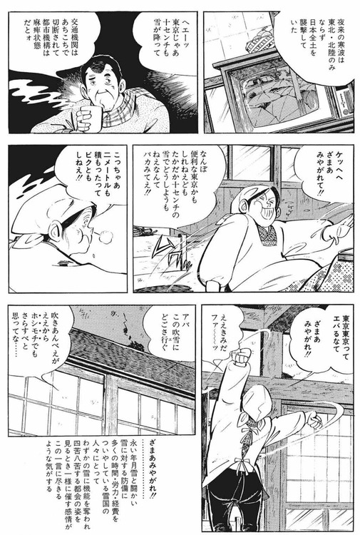 スポンサーリンク 矢口高雄「雪国の人々は東京がわずかな積雪で機能停止すると『ざまあみやがれ』と思う」 ゴールデンタイムズ 2026.01.12 スポンサーリンク 1 :ななしさん :26/01/10(土) 23:56:32 ID:??? 分からんでもない 2 :ななしさん :26/01/10(土) 23:58:09 ID:??? そしてすぐに直面するのだ 逃れがたい雪かきの存在と 10 :ななしさん :26/01/11(日) 00:05:27 ID:??? その一部で暮らしてたスーパー画力銀行員 続きを読む Source: ゴールデンタイムズ