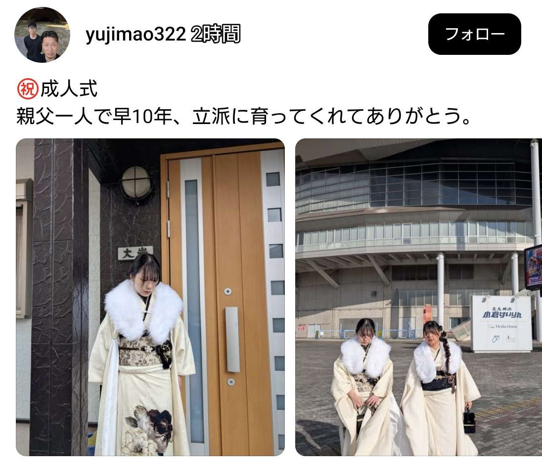 【画像】シングルパパさん、娘の成人式を祝い感無量