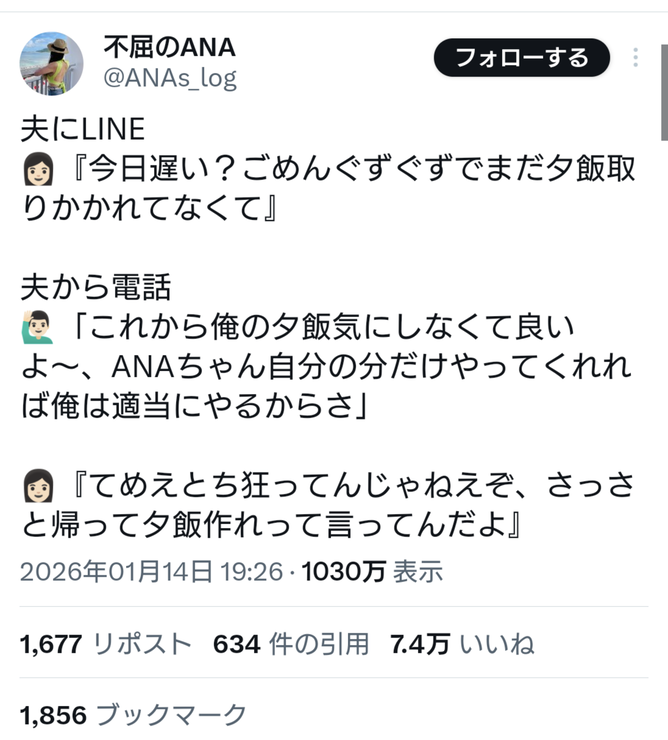 🙋🏻♂️「これから俺の夕飯気にしなくて良いよ〜、ANAちゃん自分の分だけやってくれれば俺は適当にやるからさ」👩🏻『てめえとち狂ってんじゃねえぞ、さっさと帰って夕飯作れって言ってんだよ』