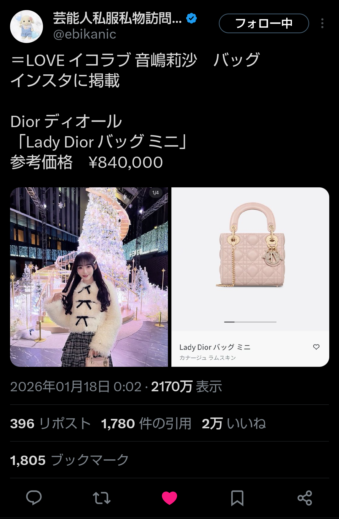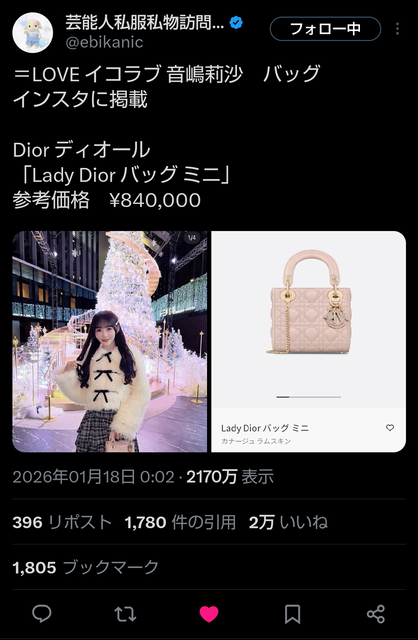 参考価格 ¥840,000 pic.twitter.com/kGr4ayt30k— 芸能人私服私物訪問店| 👶🏻 ྀི (@ebikanic) January 17, 2026