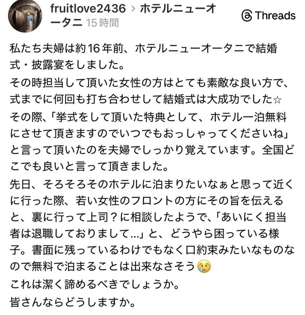 流石にホテル側も16年後に急にこんなこと言われても困るやろ
