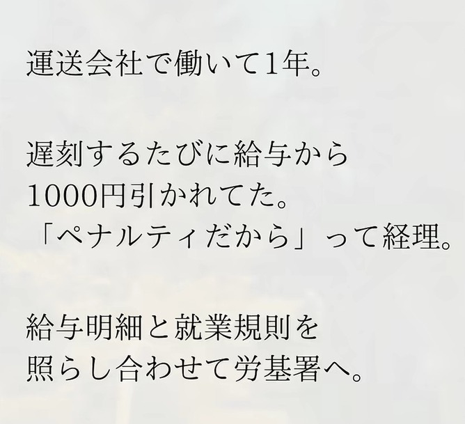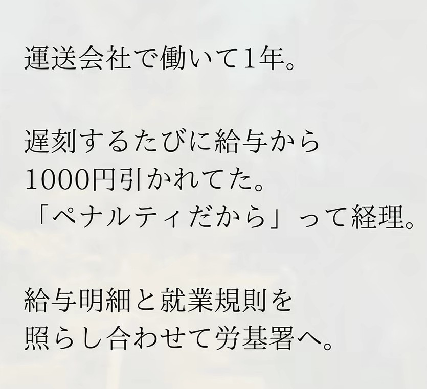 【画像】男さん「運送会社で働いて1年。遅刻するたびに1000円引かれていた。許せない。」