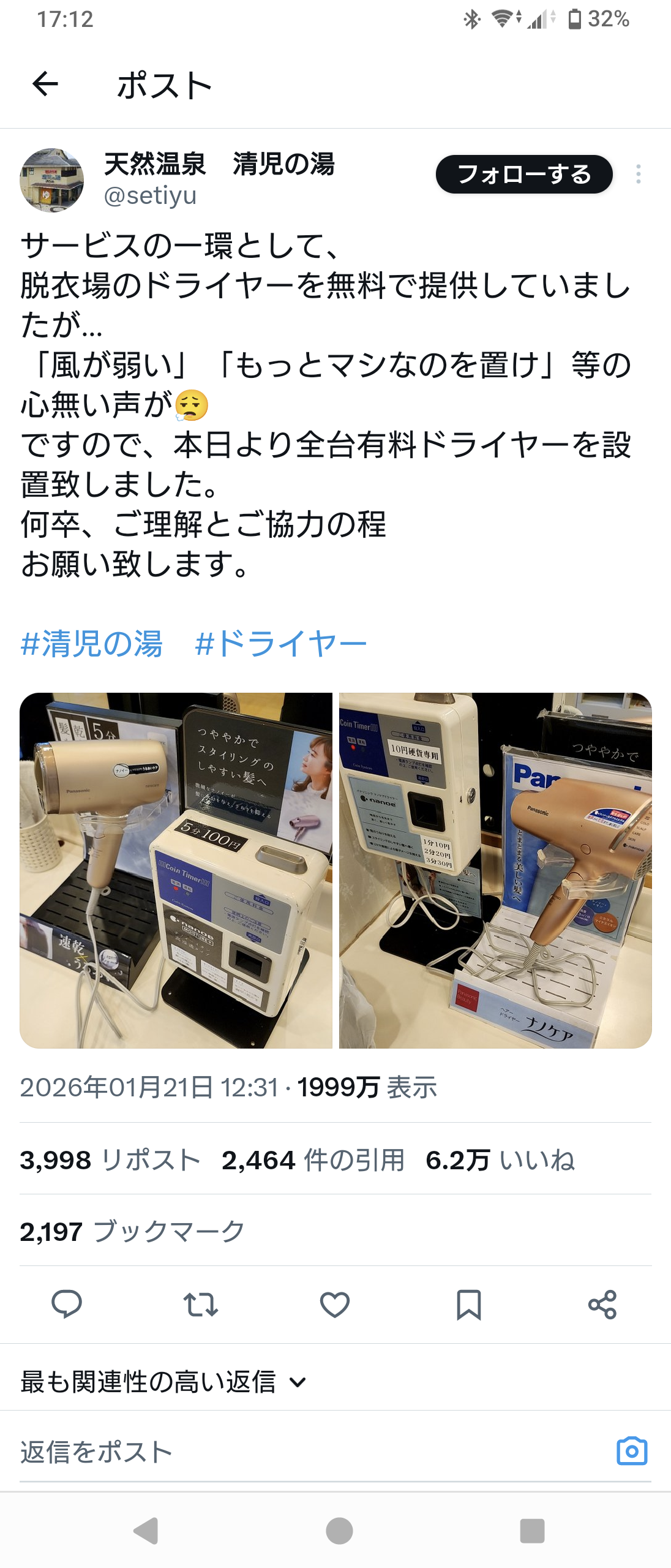 お願い致します。#清児の湯 #ドライヤー pic.twitter.com/6XXNLvC4Q3— 天然温泉 清児の湯 (@setiyu) January 21, 2026
