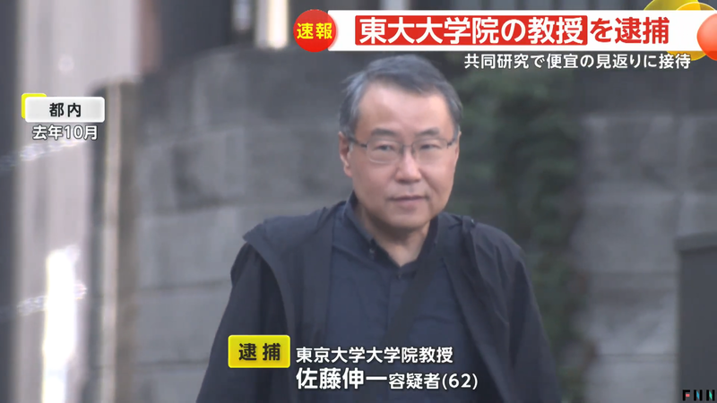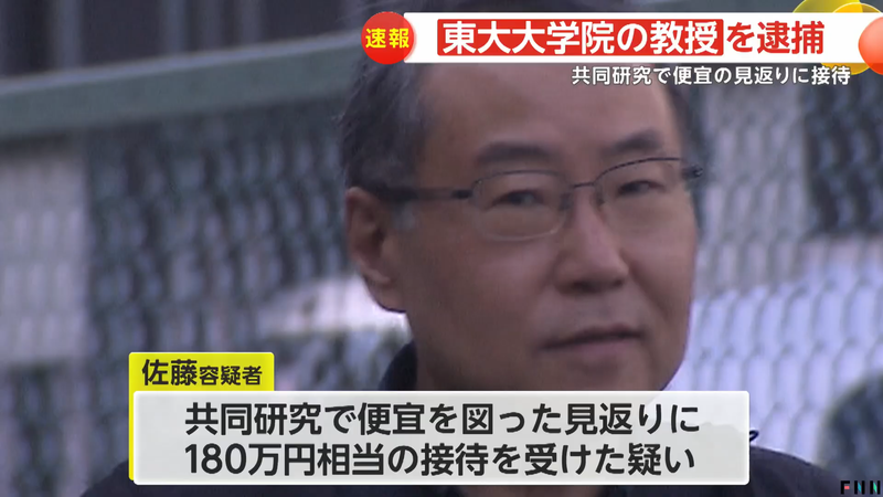 収賄の疑いで逮捕された東大大学院の教授・佐藤伸一容疑者(62)は、共同研究内容の選定などで便宜を図った見返りに、東京都内の高級クラブや風俗店で180万円相当の接待を受けた疑いが持たれています。