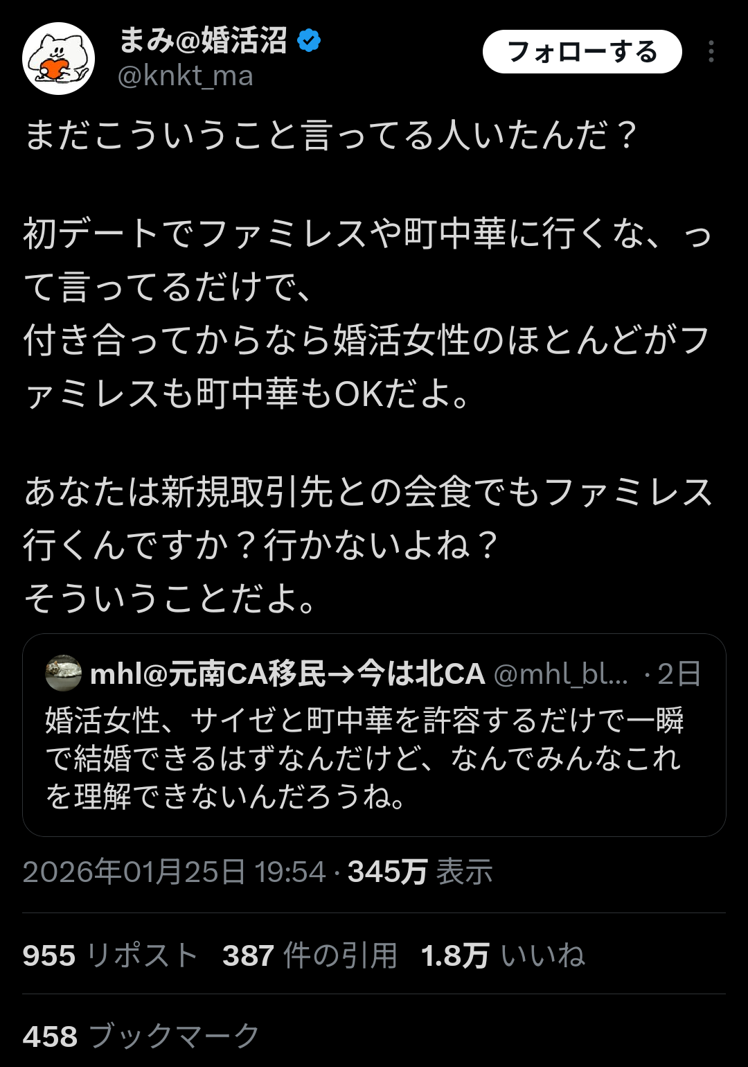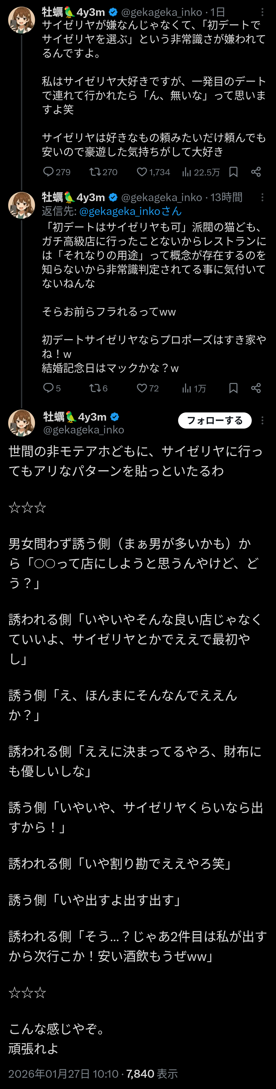 女性「初デートでサイゼリヤは無理だわ!お前は新規取引先との会食でサイゼリヤ行くのか?」