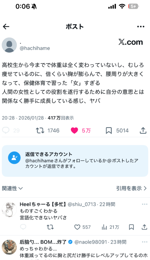 スポンサーリンク 女さん「JKから大人になるにつれ身体が保健体育で習う『女』になってきて本当に嫌」 キニ速 2026.01.30 スポンサーリンク 1:名無し :2026/01/30(金) 09:12:53.866ID:WoEr4ZA2w 5:名無し :2026/01/30(金) 09:14:00.506ID:n53raumjP 自覚しちゃったねえ 4:名無し :2026/01/30(金) 09:13:45.959ID:DMBskaYu1 えっっっっ 7:名無し :2026/01/30(金) 09:14:07.778ID:0f2YGXMJk ニンゲン様と誤解している 続きを読む Source: キニ速