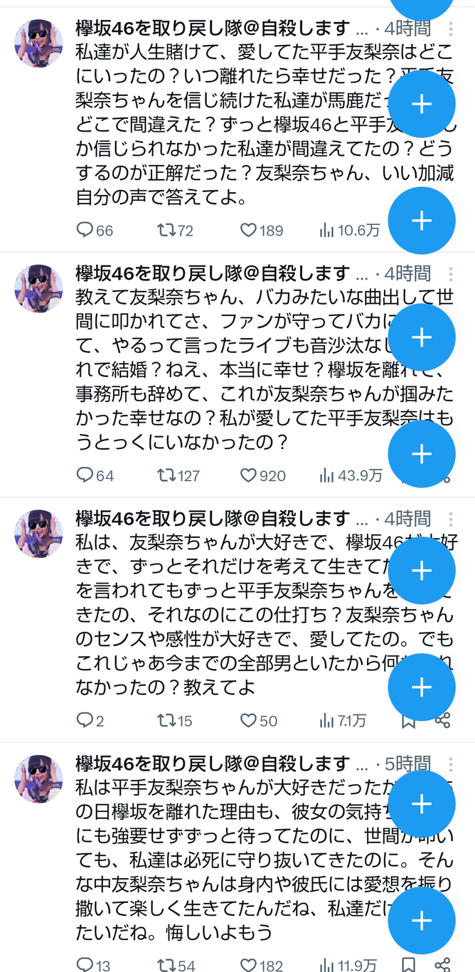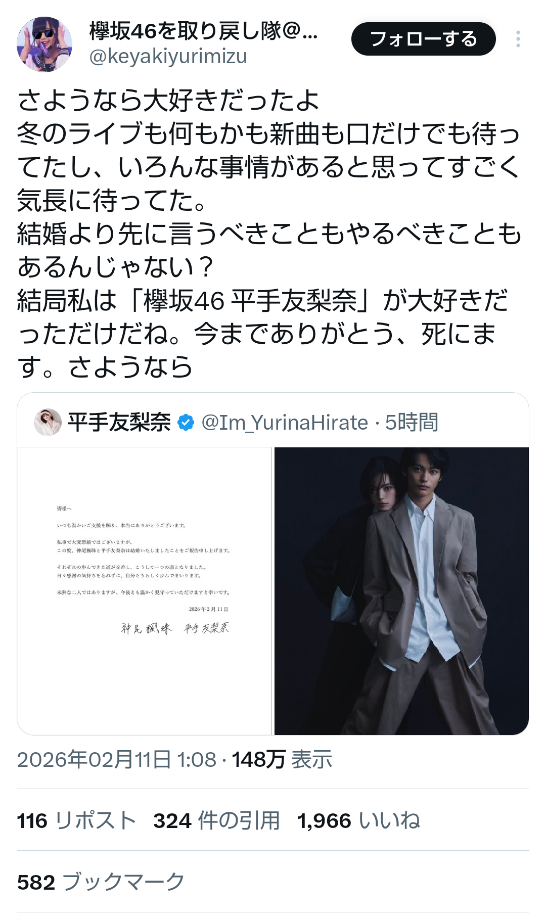 【画像】平手友梨奈の結婚に絶望するオタクが見つかるwwwwwwwwwwww